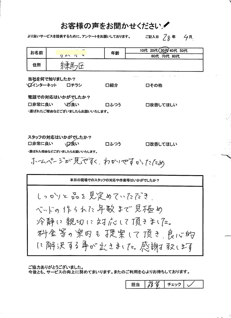 しっかりと品を見定めていただき、ベッドの作られた年数まで見極め冷静、親切に対応していただきました。